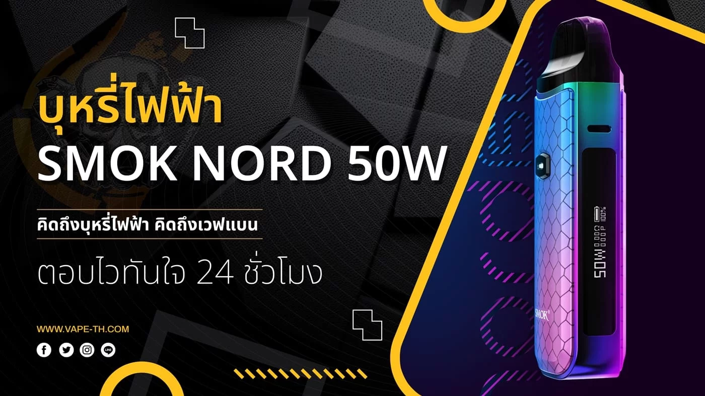 และ ตัวเครื่อง SMOK NORD 50W จ่ายกำลังไฟได้อยู่ที่ 5W – 50W ถูกออกแบบให้ใช้งานร่วมกับ คอยล์ LP2 0.6 ohm / SMOK NORD 0.6 ohm / RPM ทั้งตะกลู บรรจุน้ำยาได้ 4ml แถมยังสามารถปรับการไหลเวียนของอากาศได้อีกด้วย ให้ฟิลสูบแบบ MTL, RDL ให้ฟิลสูบที่ นุ่ม ลื่น เหมาะกับ น้ำยา ซอลนิค และ น้ำยา ฟรีเบส ให้กลิ่นหอมหวานชัดเจน ควันแน่นๆ ตูมๆ ทางร้าน เวฟแบน ขอแนะนำเลยครับ ราคาถูก ไม่แพงมาก จับต้องได้ ใช้ได้ยาวนาน คุ้มราคาแน่นอนครับ ห้ามพลาด