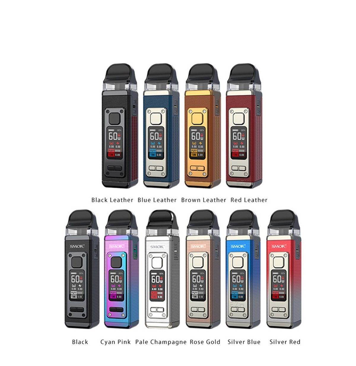 SMOK RPM 4 POD KIT 60W เป็น บุหรี่ไฟฟ้า แบบ พอต System มีการออกแบบดีไซน์ที่สวยงามและมีคุณภาพมากๆ มีขนาดที่เล็กพกพาได้อย่างง่ายดายจับได้พอดีมือ มาพร้อมกับแบตเตอรี่ที่มีขนาด 1650mAh สามารถใช้ได้อย่างยาวนาน แถมยังมีหน้าจอแสดงสถานะ TFT ขนาด 0.96 นิ้ว การชาร์จเป็น พอตชาร์จใช้สาย USB Type – C Fast Charging ชาร์จเร็วเต็มไว สามารถจ่ายไฟได้ตั้งแต่ 5W – 60W สามารถบรรจุน้ำยาบุหรี่ไฟฟ้าได้ 5 ml เหมาะกับ น้ำยา ฟรีเบส และมีสีให้ผู้ใช้ได้เลือกหลากหลายสี จะมีสี Regular Series – Black – Pale Champagne – Rose Gold – Silver Red – Silver Blue – Cyan Pink ซีรีส์หนัง – Black leather – Red Leather – Blue Leather – Brown Leather เป็นต้น ขอแนะนำเลยครับสำหรับ SMOK RPM 4 POD