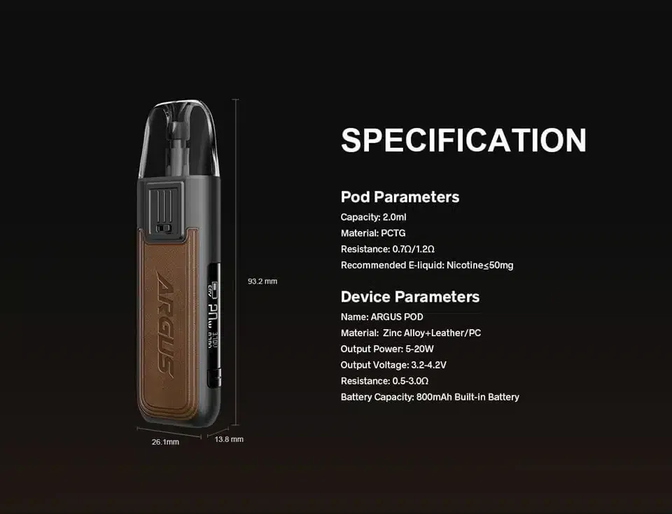 - Resistance Range: Argus Pod 0.7ohm / Argus Pod 1.2ohm